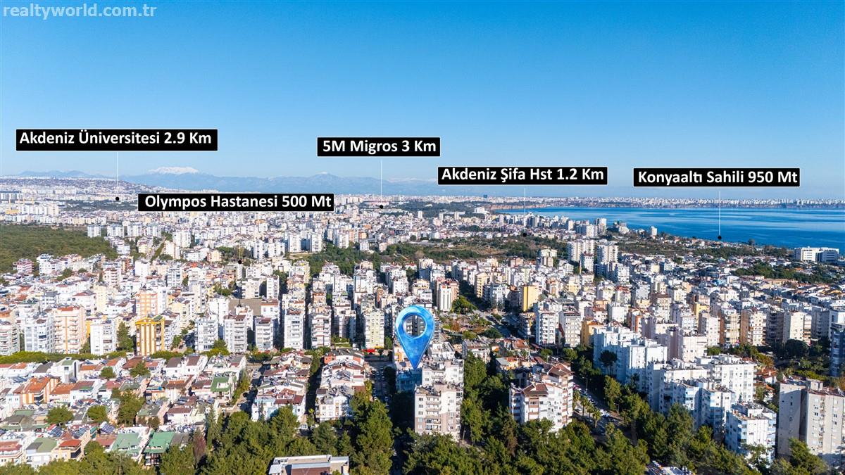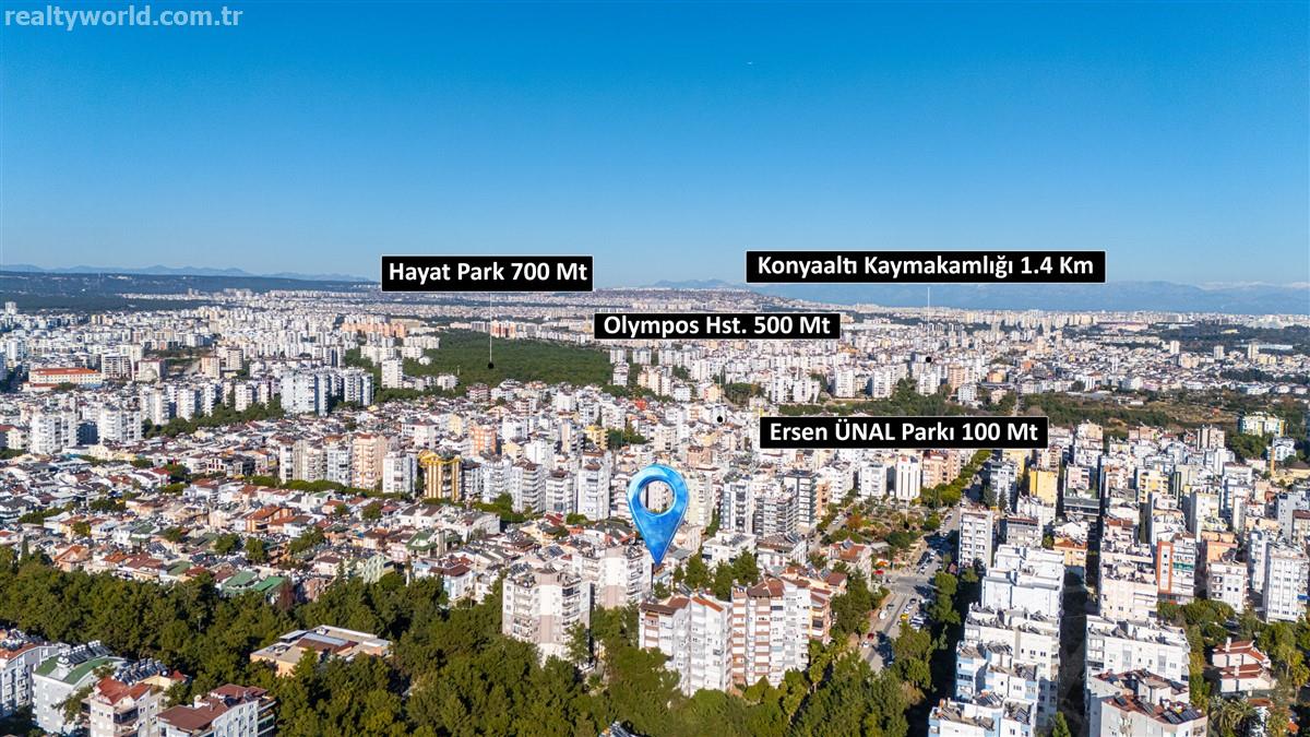 Konyaaltı Plajı/Sahiline, market, pazar, hastane, eczane, park, okul vb. yürüyüş mesafesinde çok merkezi bir lokasyonda olmasının yanında yeşil çam ağaçları arasında çok huzurlu ve nezih bir lokasyonda bulunmakta